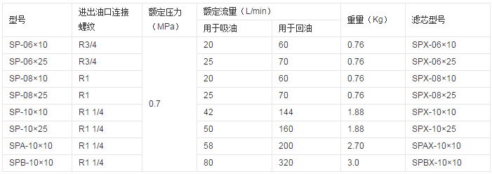 SP旋轉式管路過濾器是一種管路過濾器,用于液壓系統回油過濾或低壓供油系統過濾,清除油液中由于元件磨損產品生產生的金屬顆粒,以及其他雜質等污染物。該過濾器濾頭為鋁合金材質,外形美觀、經久耐用。濾芯選用高性能濾材制造,通油阻力小、納污能力大、過濾效果好。 在濾頭內裝有旁通閥,當鋼殼濾芯堵塞時,油液從旁通閥進入系統仍能工作,在適時停機后須更換鋼殼濾芯。濾頭上設有有安裝污染堵塞發訊器孔,以便檢測濾芯使用使用情況。