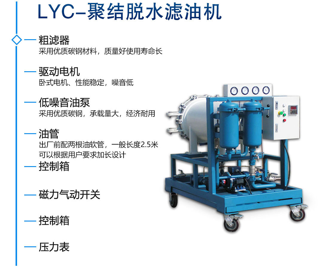 聚結脫水濾油機LYC-J系列該濾油機用要用于由于液壓潤滑系統(tǒng)中水的存在會引起油液氧化,使油液變質,減小油膜厚度,降低潤滑性,引起油液變性聚合而形成大分子,使油液粘度改變,形成有機酸,進而腐蝕金屬表面,降低或喪失油液的介電強度。對于傳統(tǒng)的過濾與分離設備,從相互混雜在一起的一種液體中分離出另一種液體尤為困難,我公司研制的聚結分離式濾油機集精密過濾和高校脫水為一體,可有效清除油液中的顆粒雜質和乳化水,游離水,而不損害元產(chǎn)品的品質。對于含大量水分的油液,其分離效果尤為顯著,分離速度是傳統(tǒng)速度的幾倍到幾十倍。