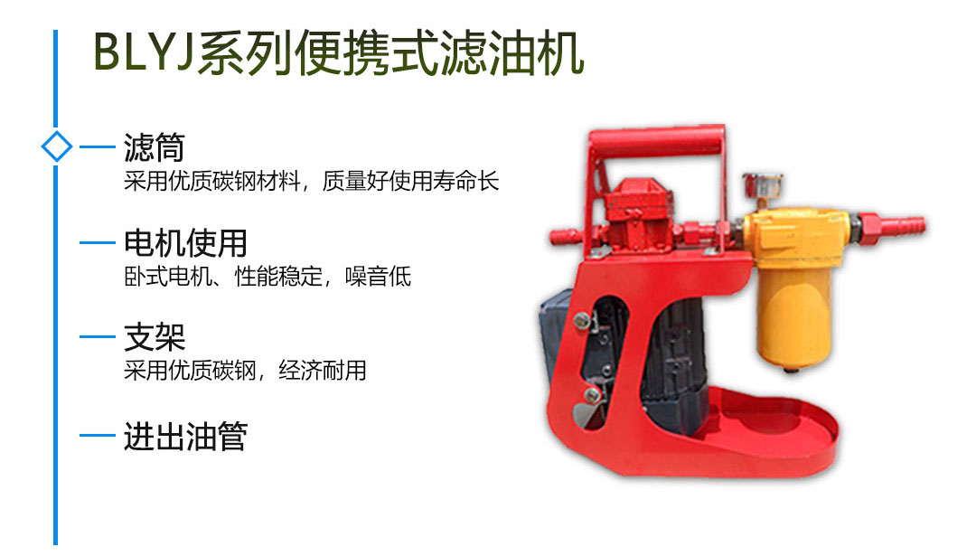 BLYJ系列便攜式濾油機是我公司研制一種超便攜式的加油、濾油機,本濾油機攜帶方便,可在野外隨時隨地對各種液壓潤滑設備進行加注,并對油液進行凈化,吸油口粗過濾器保護油泵,并延長主過濾器的使用壽命,精過濾器可根據用戶的不同需要,選擇不同的精度,達到所需要的結果。