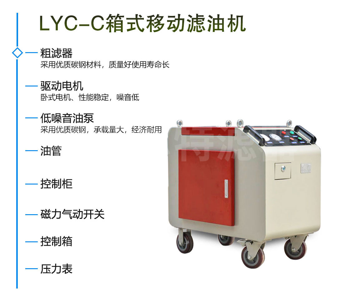 FLYC-63C-三級過濾防爆箱式移動濾油機屬于箱式移動濾油機系列,和其他箱式濾油機不同,箱型濾油機可以根據客戶需要選擇不同體積的濾油機,作為油液盛放工具,方便油液過濾。